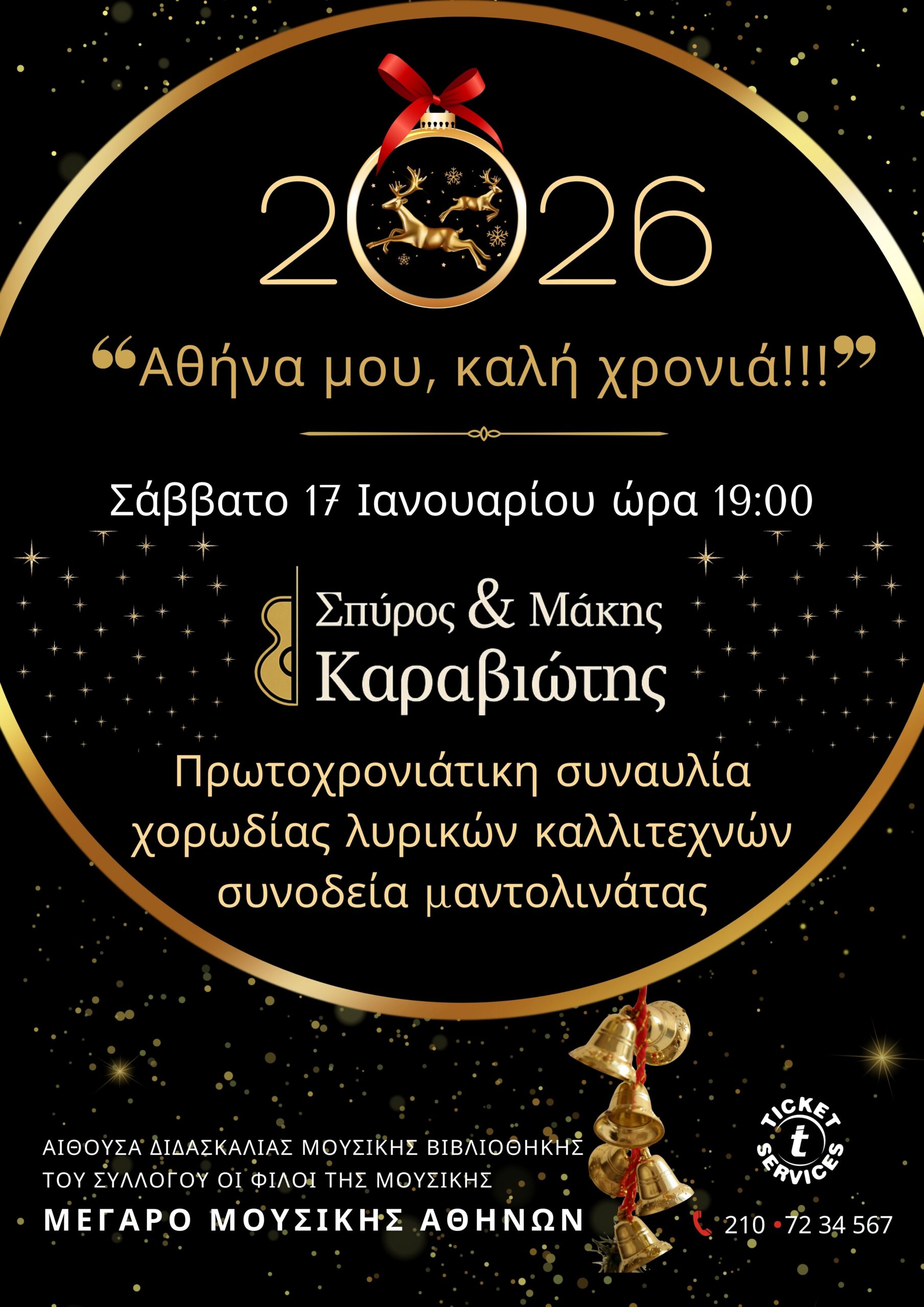 Το Σάββατο 17 Ιανουαρίου 2026, στις 19:00, στην Αίθουσα Διδασκαλίας του συλλόγου «Οι φίλοι της Μουσικής», στο Μέγαρο Μουσικής Αθηνών (Βασιλίσσης Σοφίας & Κόκκαλη), οι τραγουδιστές Σπύρος & Μάκης Καραβιώτης συμπράττουν με εκλεκτούς φίλους καλλιτέχνες, μουσικούς και λυρικούς τραγουδιστές, παρουσιάζοντας μια ξεχωριστή πρωτοχρονιάτικη συναυλία με τίτλο: «Αθήνα μου, καλή χρονιά!»