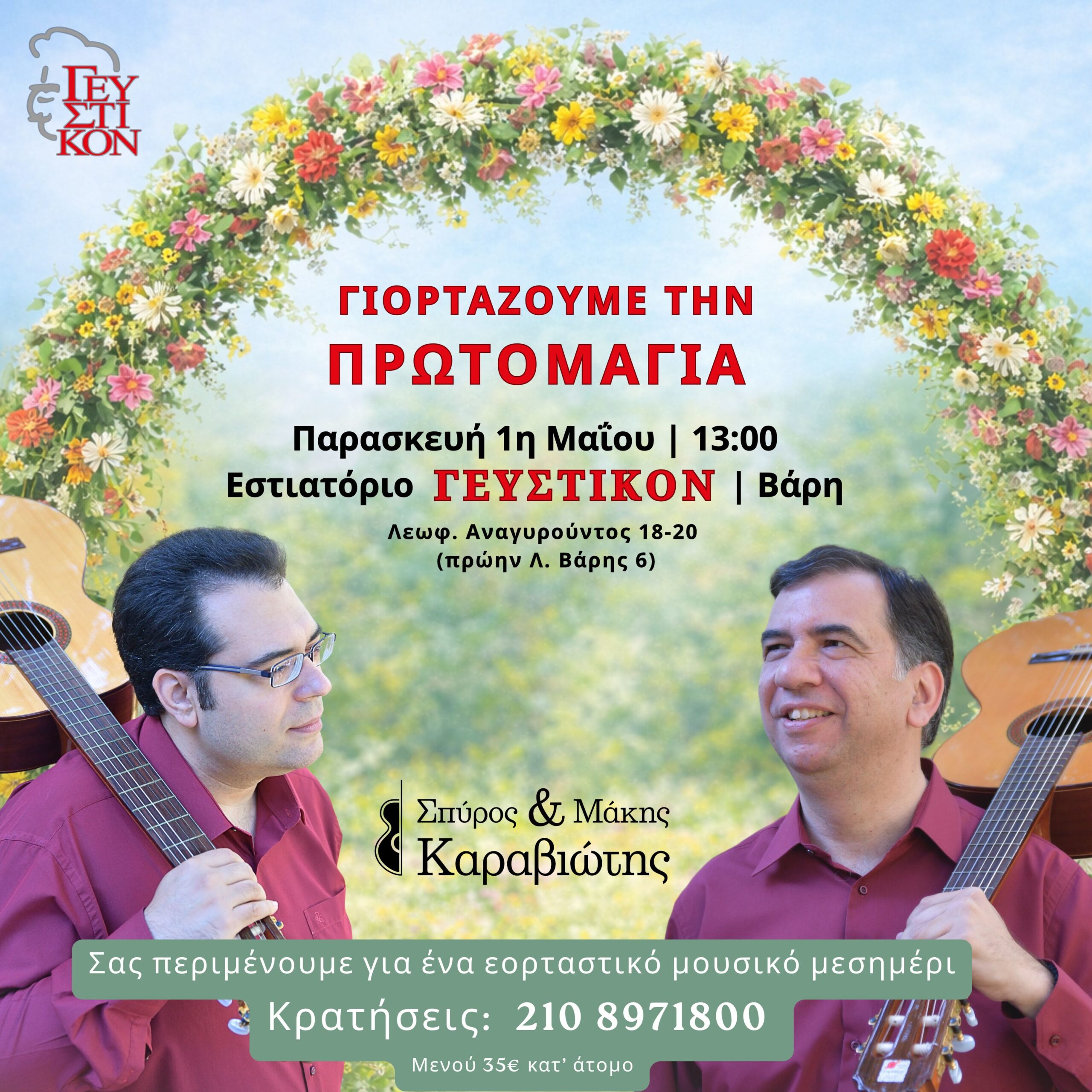 Την Παρασκευή 1η Μαΐου, στις 13:00, το εστιατόριο «Γευστικόν» στη Βάρη σας προσκαλεί σε ένα ξεχωριστό εορταστικό μουσικό μεσημέρι, γεμάτο ανοιξιάτικη ατμόσφαιρα, εκλεκτές γεύσεις και τραγούδια της παρέας, από το μουσικό σχήμα των πολυαγαπημένων αδελφών Καραβιώτη.