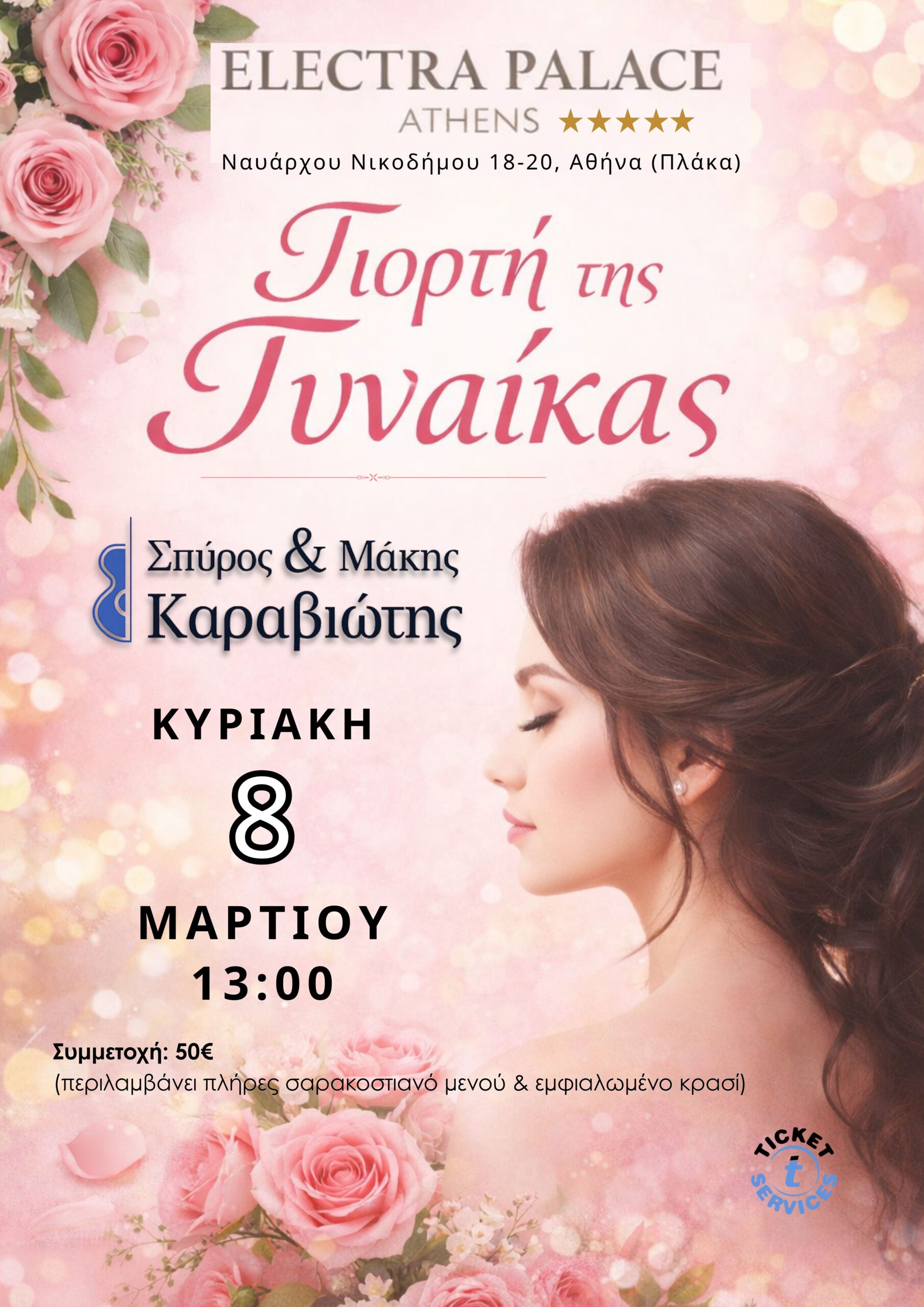 Electra Palace Ναυάρχου Νικοδήμου 18 – 20, Πλάκα, Αθήνα, Αττική, Ελλάδα«Γιορτή της Γυναίκας» Κυριακή 8 Μαρτίου 2026 | Ώρα έναρξης: 13:00 Electra Palace Athens ★★★★★ Ναυάρχου Νικοδήμου 18–20, Πλάκα Η Γυναίκα τιμάται και γιορτάζεται σε μια ξεχωριστή μεσημεριανή εκδήλωση υψηλής αισθητικής, μουσικής και γαστρονομίας, στην [...]